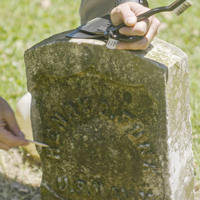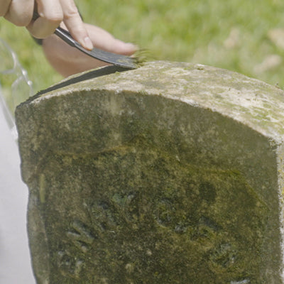 Once the headstone is wet, use Headstone Helper tools to remove lichens, moss, algae, and other soilings.