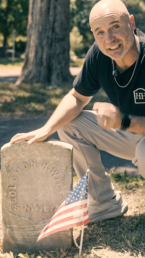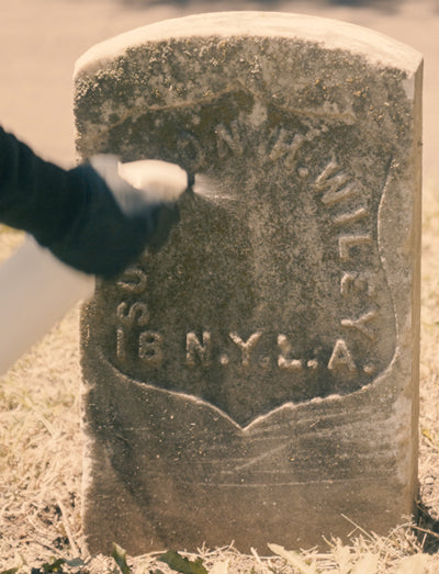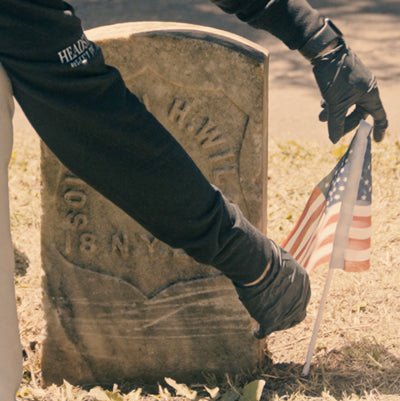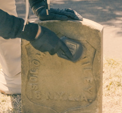 Take time to show gratitude and appreciation. In this case, we've cleaned a Civil War shield headstone, so we're placing a flag beside the headstone.